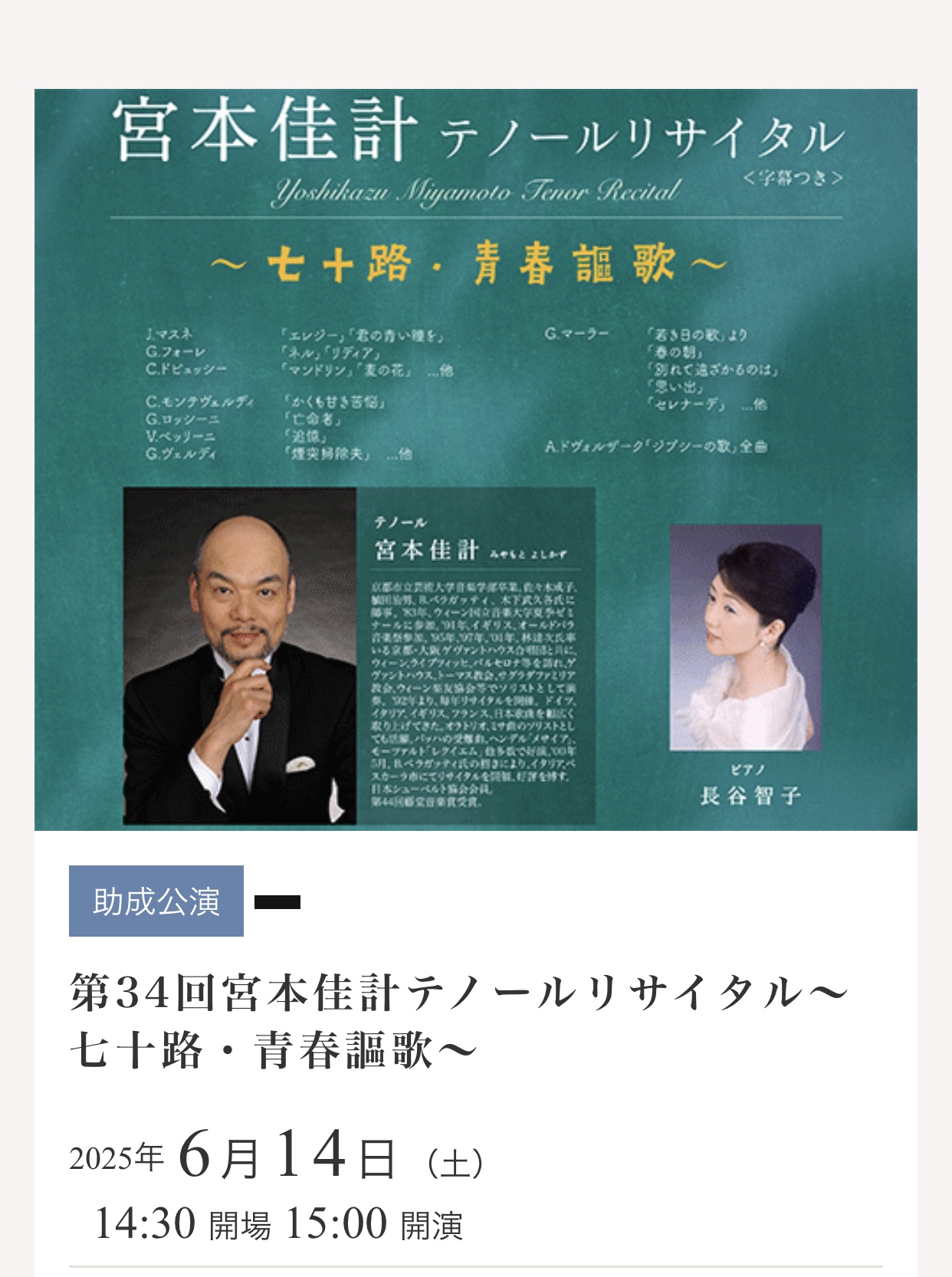 2025年6月14日(土)青山バロックザールにて宮本佳計テノールリサイタル